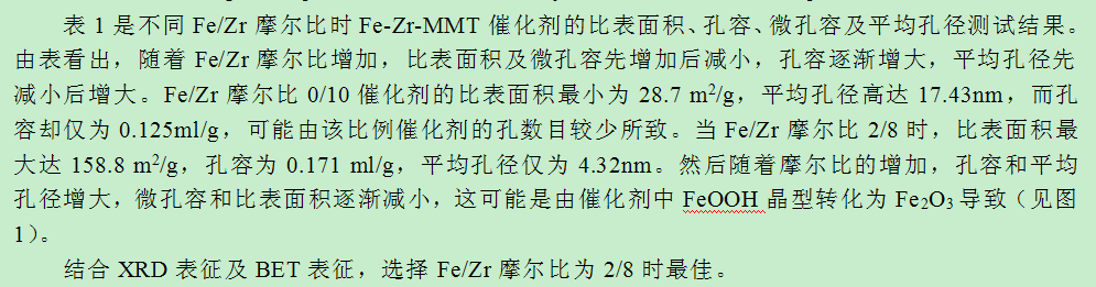 表1是不同Fe/Zr摩尔比时Fe-Zr-MMT催化剂的比表面积、孔容、微孔容及平均孔径测试结果。由表看出,随着Fe/Zr摩尔比增加,比表面积及微孔容先增加后减小,孔容逐渐增大,平均孔径先减小后增大。Fe/Zr摩尔比0/10催化剂的比表面积最小为28.7 m2/g,平均孔径高达17.43nm,而孔容却仅为0.125ml/g,可能由该比例催化剂的孔数目较少所致。当Fe/Zr摩尔比2/8时,比表面积最大达158.8 m2/g,孔容为0.171 ml/g,平均孔径仅为4.32nm。然后随着摩尔比的增加,孔容和平均孔径增大,微孔容和比表面积逐渐减小,这可能是由催化剂中FeOOH晶型转化为Fe2O3导致(见图1)。