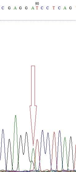 请帮忙看看下图红色箭头指向的那个点是AA还是AG 绿色的是A 黑色是G 就是A突起 而G在中间有点向上趋势又落下去了 [ Last edited by wininghe on 2012-12-3 at 13:48 ] |