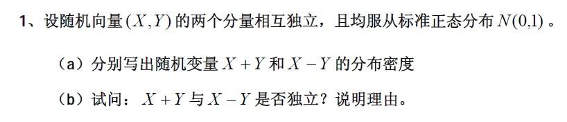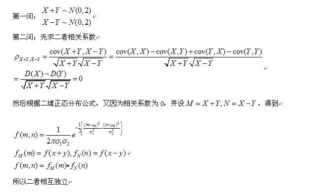 | 第一问独立的概率分布X+Y~(0+0,1+1)是均值相加,方差相加,X-Y~(0-0,1+1)这个是均值相减,方差相加。第二问的意思是先证明他们不相关,在证明独立,独立退出不相关,不相关推不出独立,所以它还要用二维正态分布证明独立性。我个人觉得可以用E[(x-y)(x+y)]=E(x-y)E(x+y)就行,左边是E(x^2-y^2)=E(x^2)-E(y^2),由于X是标准正太分布,X^2服从开方分布Χ^2(1)(这里的X是开方分布那个符号),同理Y^2也是,利用这个分布的性质它们的期望都是1,所以相减为0,左=右。楼主由于符号不好打,您将就看,希望能对你有帮助。 |