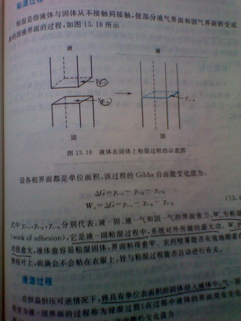 的确沾湿功的定义有不同。有的定义 把单位已经沾湿的固液界面分开环境做的最小功。有的定义是沾湿过程中系统对环境做的最大功。这二者数值相等符号相反。因为它们分别对应不同的过程。始终态正好相反。站的角度也正好相反,一个是说环境对系统作功,一个是说系统对环境作功。这样反了两次,因此其意义是相同的。即,沾湿功等于可逆沾湿过程系统对环境作的功,或者是这个过程环境对系统作的功的负值。这不是同一个过程的功的不同说法么。 |