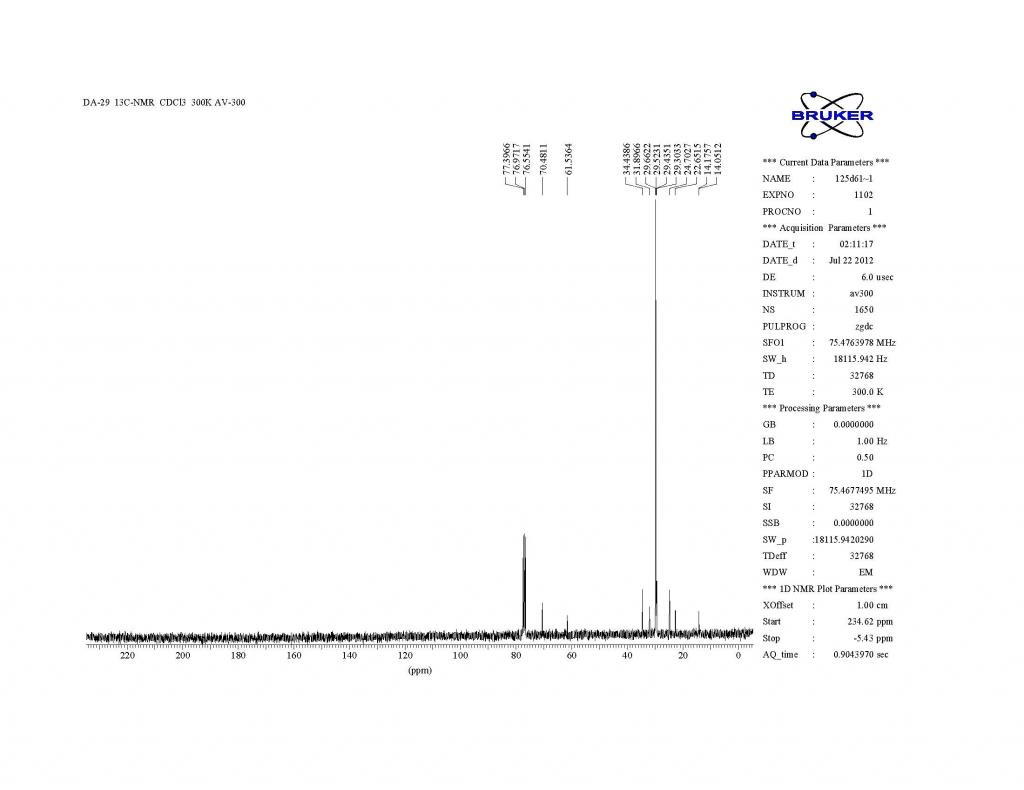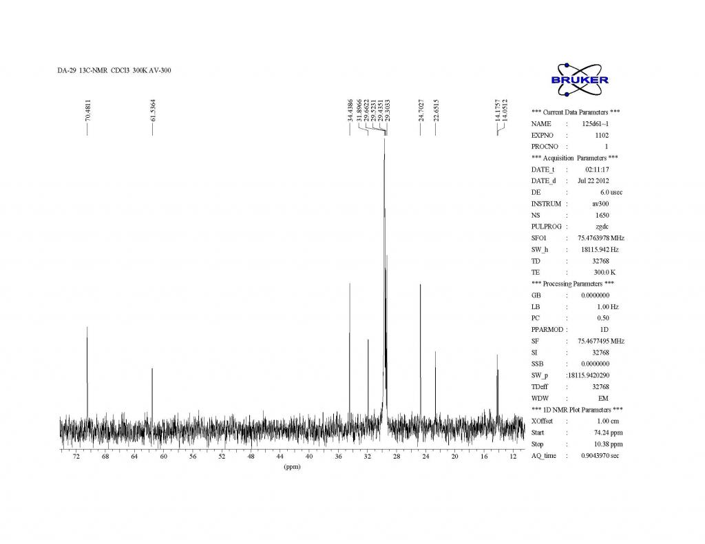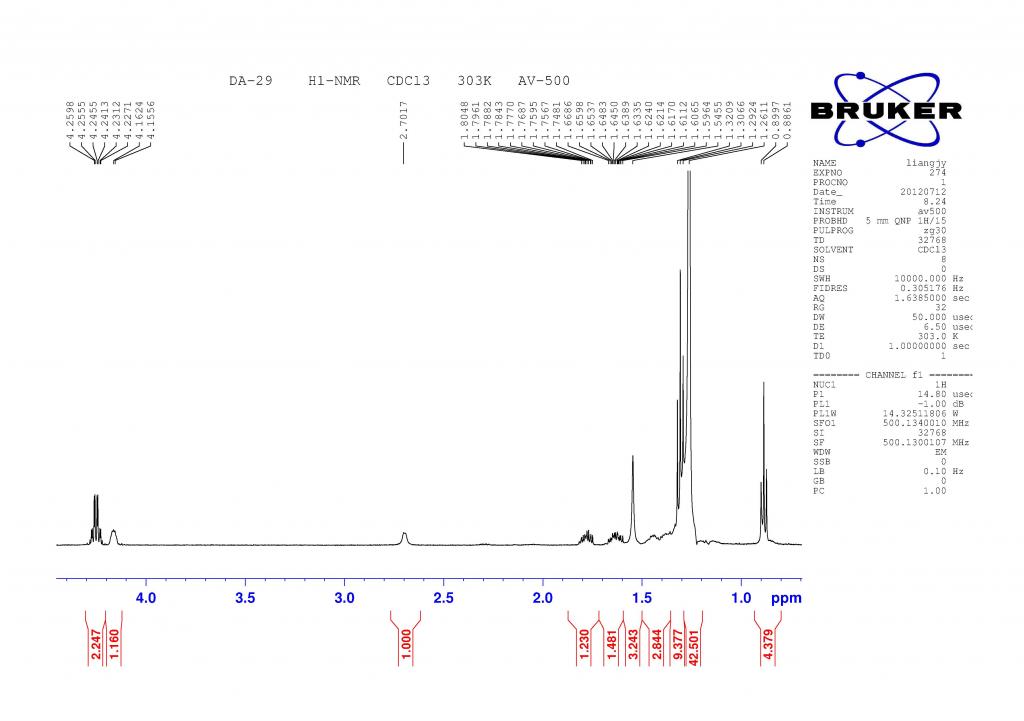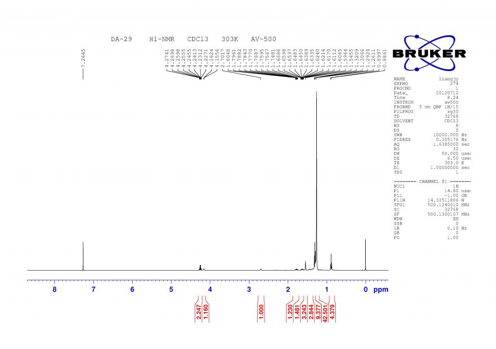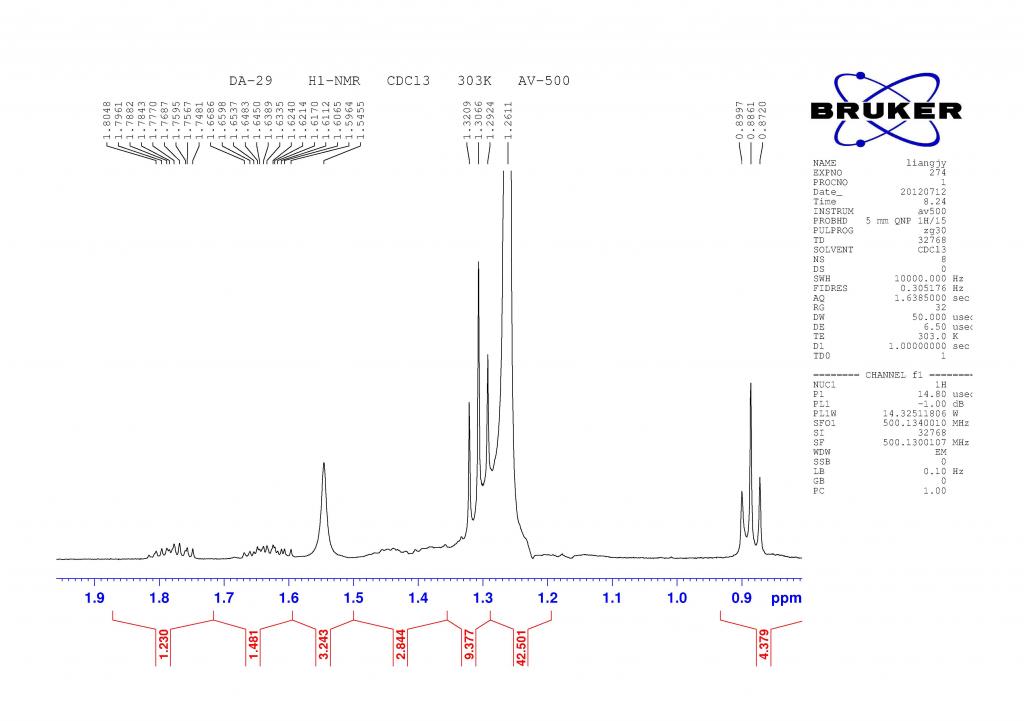 求高手解谱,是个比较简单的结构,后面42个氢可能是21个亚甲基,2.7的一个氢不知道是OH还是连在羰基上的一个次甲基,求高手指点! DSC01523.JPG H1.jpg H1-1.jpg H1-2.jpg DA-29-C13_页面_1.jpg DA-29-C13_页面_2.jpg DA-29-C13_页面_3.jpg |