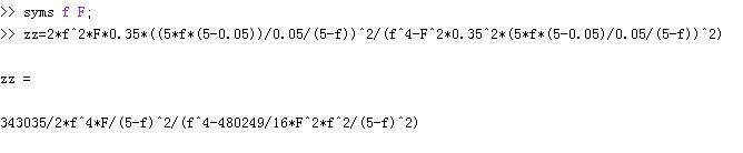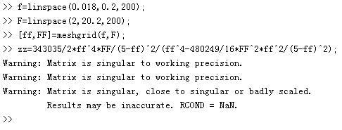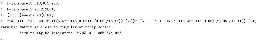 */^ 时,矩阵运算时加个.就行,如 .* ./ .^ 等, zz=2.*ff.^2.*FF.*0.35.*((5.*ff.*(5-0.05))./0.05./(5-ff)).^2./(ff.^4-FF.^2.*0.35.^2.*(5.*ff.*(5-0.05)./0.05./(5-ff)).^2) 在FF前加个.和/前加个. 上次我没有代入矩阵验证,少些了两个. |