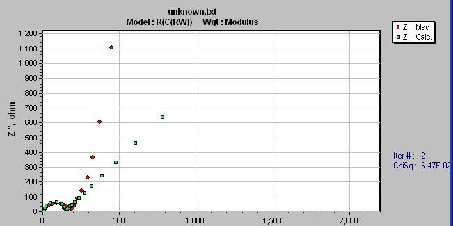 1. 阻抗谱拟合结果的误差偏大了点,说明等效电路不太合适,将R(C(RW))中的C改成Q,估计要好些。 2. 对离子电导率的测试和计算,阻抗谱测试是一个很好的办法,但你计算使用的电阻不是拟合出来的数值,而是按下面公式计算: condctivity = (Thickness/Length) * Z'/(Z^2) Here: Z': 阻抗的实部, Z: 阻抗的模量(=(实部平方+虚部平方)的开平方) 这样出来是一系列数值,你可以将这些数据以频率(X轴)作图,当电导率不随频率增加而明显增大时的数值作为电导率。 还有一种办法,干脆就取几个高频时的实部和模量来计算,如果变动不大时,就用这个频率作单频率测试,再计算也行。 |