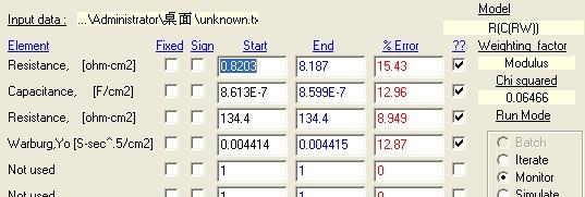 我现在对离子导电率的计算还不是很清楚,我做的是锂离子导电玻璃,下面是我计算的整个过程请高手看一下各环节是否有问题: 交流阻抗测试的玻璃片两面涂上银浆,120℃干燥。用PARSTAT2263电化学工作站的Single Sine的Default SS测交流阻抗,频率范围为2MHz-10mHz,电流为10mA。 测的数据用ZSimpWin软件进行拟合,如图,等效电路为 R(C(RW)), 离子导电率我用的公式为:δ=d/(AR),其中d是玻璃片厚度,A是表面积,R是等效电路 R(C(RW))中的第二个R,也就是第二个图里面参数中的第二个R(134.4Ω)。 我的问题是: 1、等效电路和计算公式选择是否有错? 2、我的玻璃片的电子导电率是否可以这么算:用参数中的第一个R代入上面公式的结果 3、第二个图参数的第一个Resistance的start和end数据相差很大该用哪个?是不是应该相差很小?start和end指的是什么? 拟合图.jpg 各参数.jpg [ 来自科研家族 快乐检索 ] |
