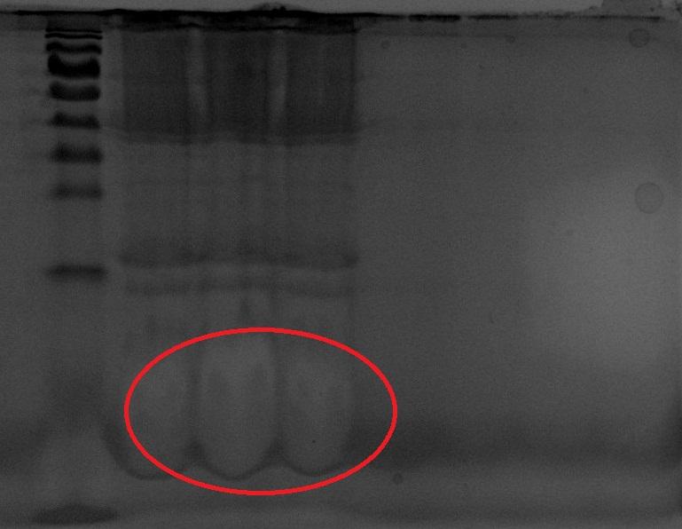 求助,SDS-PAGE电泳图(Marker最后一个条带跑不出,胶底部很奇怪)