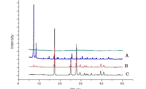 我做了一下A的稳定性检测:把材料A放在水溶液中浸泡,一段时间后,洗涤过滤,得到B(发生分解),如图,A为原材料,B为分解产物,C为A合成过程中加的配体,从图中可以看出,B、C出峰位置以及强度基本都能对上 我想问一下,B的XRD中5-10°之间的那两个小峰如何解释?是不是A还有残留(我想那两个位置的峰应该是A的特征峰)? ![]() ![]() ![]() 未标题-1.jpg |