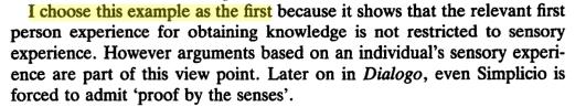 | I choose this example as the first because it shows that the relvant first person experience. However arguments based on an individual's sensory experience are part of this view point. Later on in Dialogo, even Simplicio is forced to admit "proof by the sensed". |