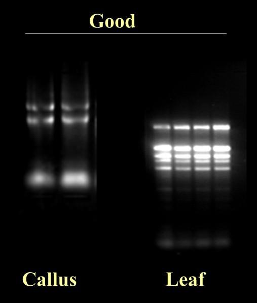 也可以是叶绿体/质体DNA,比植物基因组DNA小。线粒体DNA由于丰度问题估计是看不到。顺便问一下,你RNA样品左边的那个是什么,也有上面的带。