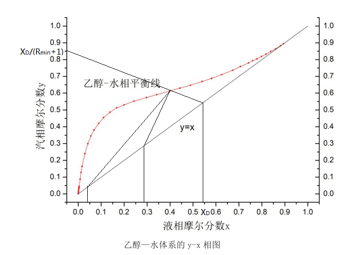 最近碰到一个很奇怪的问题:假如用给定的普通填料精馏塔来从质量分数0.5(摩尔分数0.2815)的乙醇分离到质量分数0.75(摩尔分数0.54)的产品,那么最小回流比是多少。 用作图法来算,结果吓了我一跳: 结果回流比居然是负的。。 如果真不回流那系统还能平衡吗?(老师出的题目,应该没有错的) [ Last edited by jimcorner on 2012-12-9 at 20:44 ] |