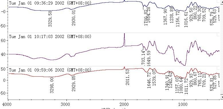 前两个为反应后的谱图,最后一个为起始对照谱图,我的反应物是酸跟醇,请问各位我的谱图中是否有酯健生成?