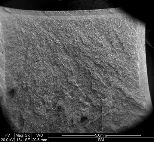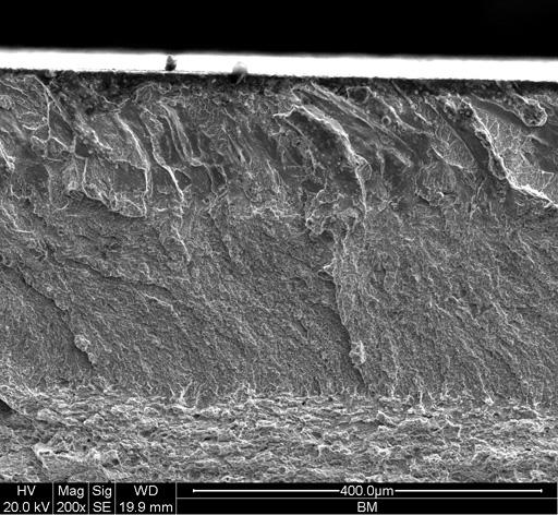 通过激光重熔在冲击试样表面预制脆性带,然后进行冲击试验。帮忙从这四张图分析裂纹形成、扩展到试样最终断裂的过程,包括断裂的形式。 600-冲击断口宏观.jpg 600-冲击断口上部脆性带.jpg 600-冲击断口中部.jpg 600-冲击断口下部.jpg |