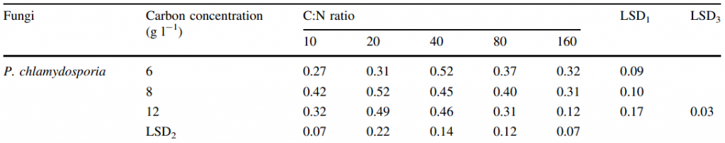 另外,该篇文献中提到: LSD1 stands for standard bias of different C:N ratios at the same carbon concentration LSD2 stands for standard bias of different carbon concentrations at the same C:N ratio LSD3 stands for standard bias of interactions of different carbon concentrations and C:N ratios within the same isolates. |