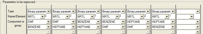 NRTL模型有5个参数,分别是a(ij)两个,b(ij)两个,c(ij)一个,共有5个参数。 NRTL/2一般代表b(ij)中的某个。NRTL/1一般代表a(ij)中的某个,NRTL/3代表cij。 这些参数,有些是aspen数据库中有的,可以直接从properties /parameters/binary interaction里面看的到。 你通过输入data后也可以通过回归得到新的相互作用参数。 |