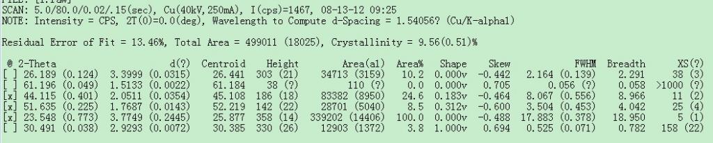 求助各位虫友,麻烦懂这个的虫友多多指点。下图是我XRD原始数据出的一个分析结果,测试中心的老师帮我分析的,可是我看不懂,每一列的含义是什么呢?根据这些结果,可以计算晶型晶体空间结构以及粒径大小吗?多谢各位了。。。 _U0]3KLH~~P4OZVA4TB6ZER.jpg |