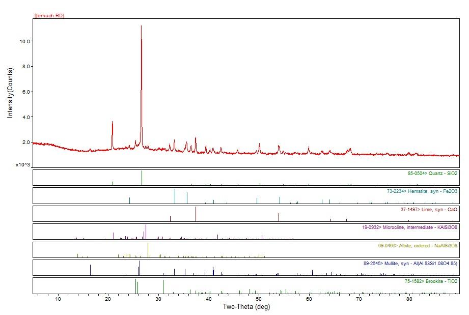 灰成分结果如下: 灰成分 Composition of ash % SiO2 Al2O3 Fe2O3 TiO2 CaO MgO K2O Na2O 50.56 18.15 9.92 0.88 10.38 0.99 1.76 1.91 MnO2 SO3 P2O5 0.20 2.17 0.05 我自己用jade5搜了一下,主要是石英和氧化钙,其它不是很明确,网上下的PDF2004,可能不是很完整。希望哪位老师给指导一下。 |