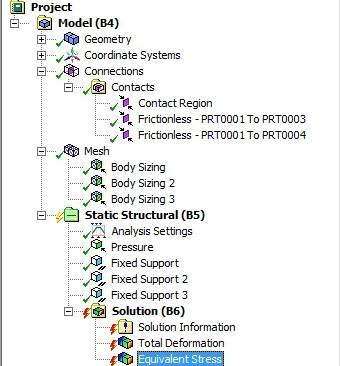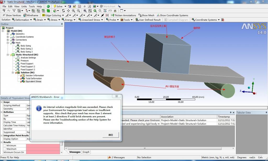 小弟刚接触ansys workbench,,现在做一个简单的例子就遇到问题了,问题是这样的,图片上的两个圆柱 是支座,中间是被压的板子,板子上面是一块垫板,垫板上面是压头(没画出来),我想把被压的板子和支座之间设置成无摩擦的,垫板和被压的板子暂时设置成连接的状态,,但是我计算的结果是这样的: