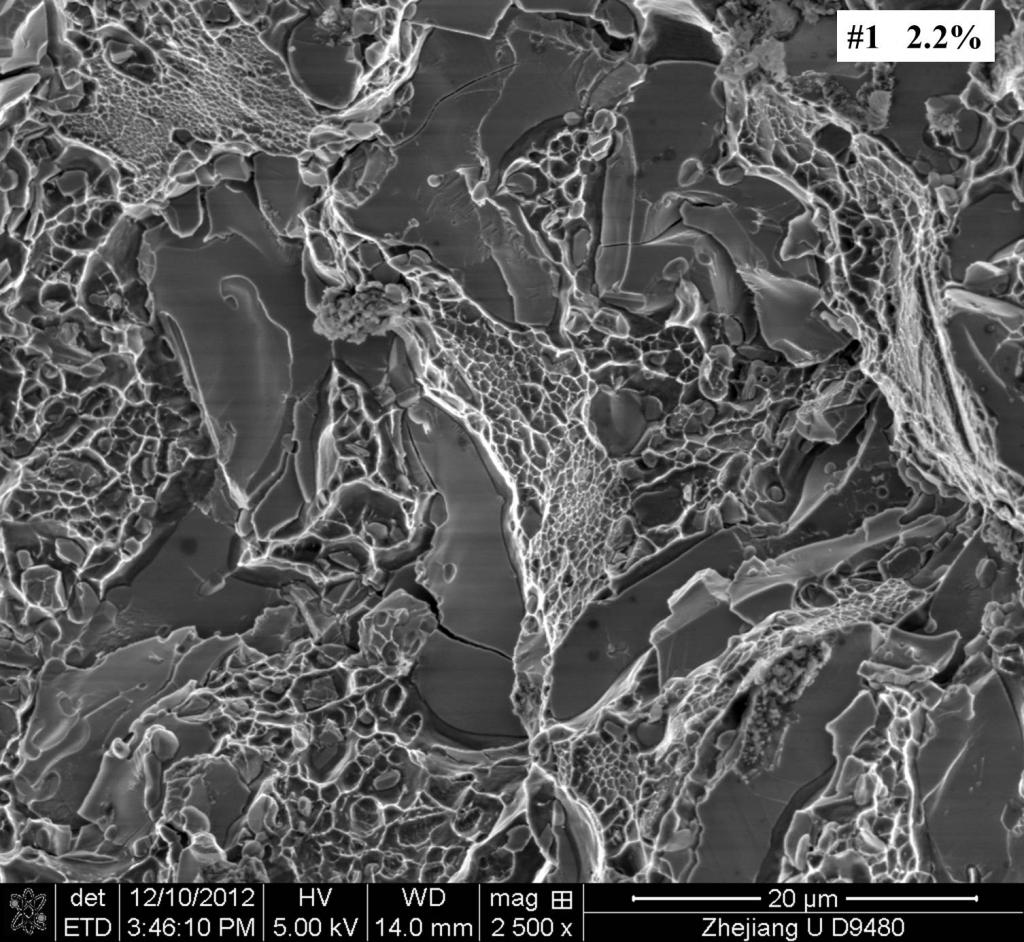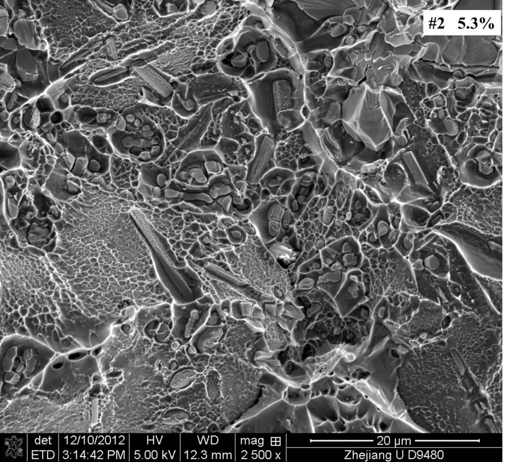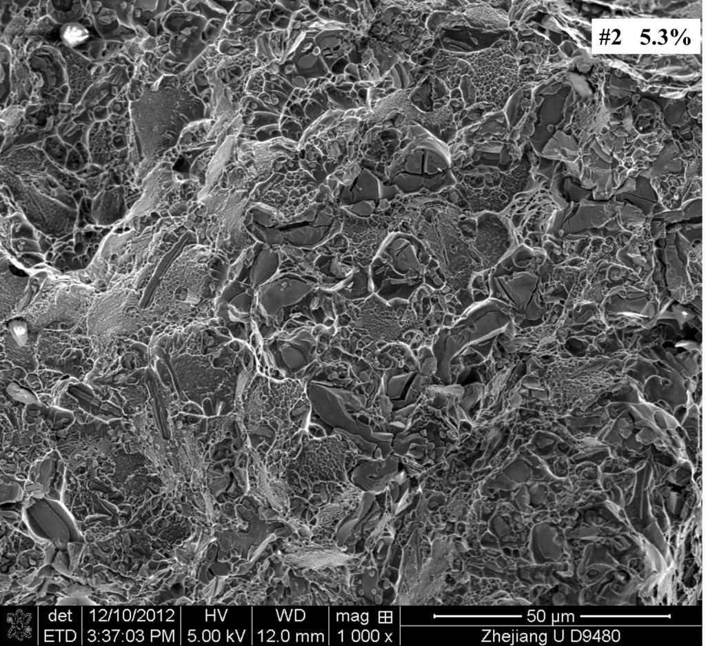 我做的是铝合金的疲劳和断裂形貌分析!你的合金属于混合断裂机理! 但是从断口上可以找到和延伸率一致的分析结果 2.2%的图片上有很多脆性粒子+塑性韧窝,二者分别是脆性断裂和韧性断裂的特点,但是很明显该图上的脆性粒子比较多,而且很多粒子因为局部应力集中,导致局部应力大于粒子自身抗拉强度,而发生了粒子的断裂!该合金偏向脆性断裂 5.3%的图片上也一样,但是该图中的韧窝明显更加多,因此偏向韧性断裂一些! 另外你的脆性粒子还不只一种呢!长条状的跟板块状的应该是不同的相!你的金属成分应该写出来,长条状的似乎强度更好点不容易裂开,可能是富-Fe相,块状的多半是Si相吧! 另外,韧窝中间存在很多小颗粒,这是沿晶断裂的特点,基体和第二相之间的界面发生了撕裂,继续变形成为小孔,小孔连接形成微裂纹!最终形貌就是韧窝!这是其一 其二:那些断裂的脆性粒子发生的是穿晶断裂,有很多的小平面出现,这是解理断裂的特征!属于脆性断裂的一种 |