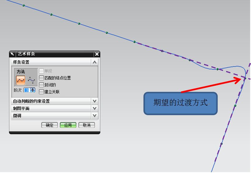 问题: 现有一空间曲线,通过UG样条导入点的坐标之后得到的曲线如下图,主要是在拐点附近由于采用高阶拟合(我们使用的是3阶,2阶和更高阶的都不如3阶的,因此选择3阶)在拐点附近不是直线过渡,我们希望的过渡形式是差不多直线过渡即可,由于要利用多条这样的曲线构建曲面,不能采用1阶拟合,其中点的坐标在附件streamtrace.dat中,不知有没有同学能不能帮忙解决这个问题 |