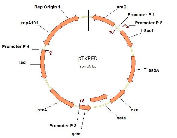 好像接触过,pTKRED, 见参考文献:Kuhlman, T. E. and E. C. Cox (2010). "Site-specific chromosomal integration of large synthetic constructs." Nucleic Acids Res 38(6): e92. 质粒序列见:http://www.ncbi.nlm.nih.gov/nuccore/GU327533.1 pTKRED.jpg |