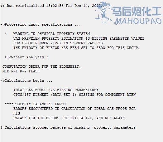应用aspen Polymer进行自由基聚合的模拟练习,操作步骤全是仿照相应的聚合案例做的,计算过程出现错误,如图片所示,不知道应该如何修正,希望各位大虫给点指教...