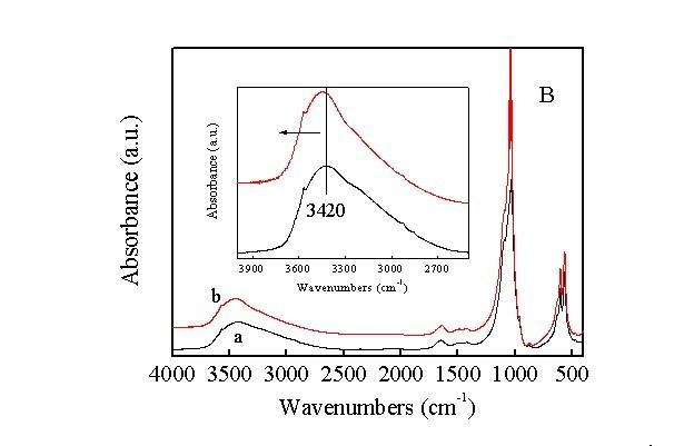 ...the -OH stretching vibrations at 3420 cm-1 also shifted to higher frequencies. The result indicated that the surface M-OH was active site and the quantitative substitution of the M-OH groups by F- played a key role in F- adsorption.