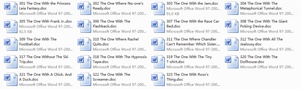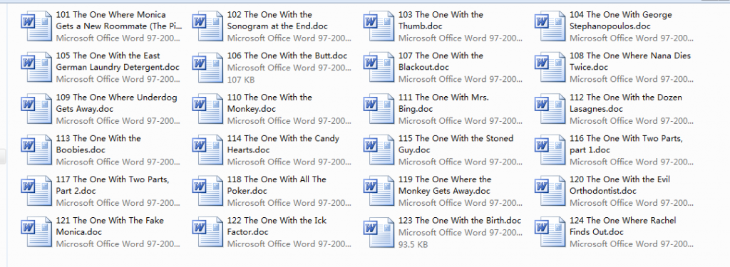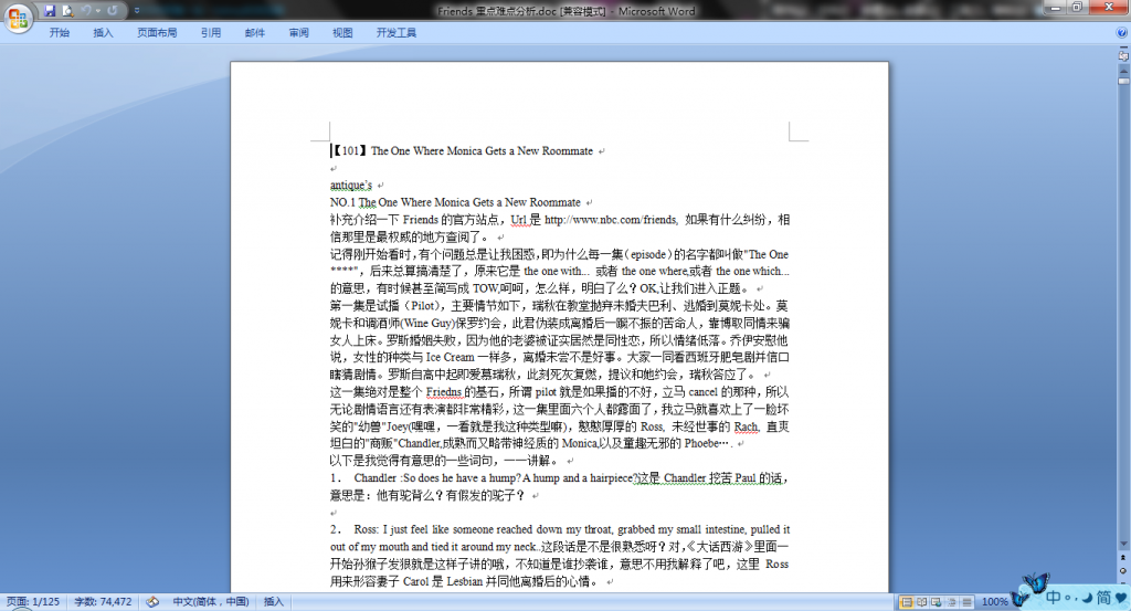 上次发的那个只有附件,截图没传上去,很多朋友建议添加个目录或者介绍一下内容。文件比较多,下面是部分截图,供大家预览。 原帖地址http://muchong.com/bbs/viewthread.php?tid=5298166 文件夹1.png 文件夹2.png 文件夹3(4~9就不发了吧).png 文件夹10.png 12.png 文档预览.png Friends中英文对照剧本.png 词汇频率表.png |