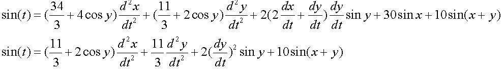 x''=x''+(11/3+2*cos(y))*x''+11/3*y''+2*y'^2*sin(y)+10*sin(x+y)-sin(t);