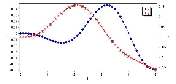 Variable t=[0:0.1:5],x=0,y=0,x'=0,y'=0;