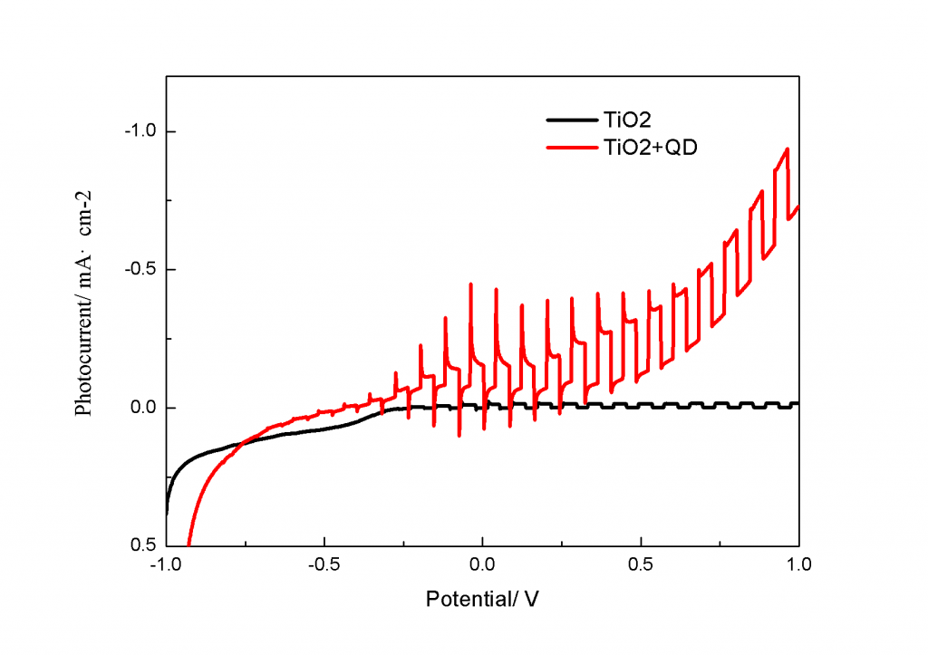图中两线分别是附有量子点的TiO2和单一TiO2的I-V曲线,它是对光阳极在光照条件下施加偏压,然后每隔一段时间挡光,记录光电流的变化。那这个I-V曲线可以说明量子点的加入能提高光电流吗?还有,为什么附有量子点的TiO2的曲线到正电位之后会上升呢? 1.png |