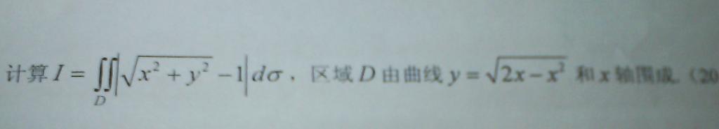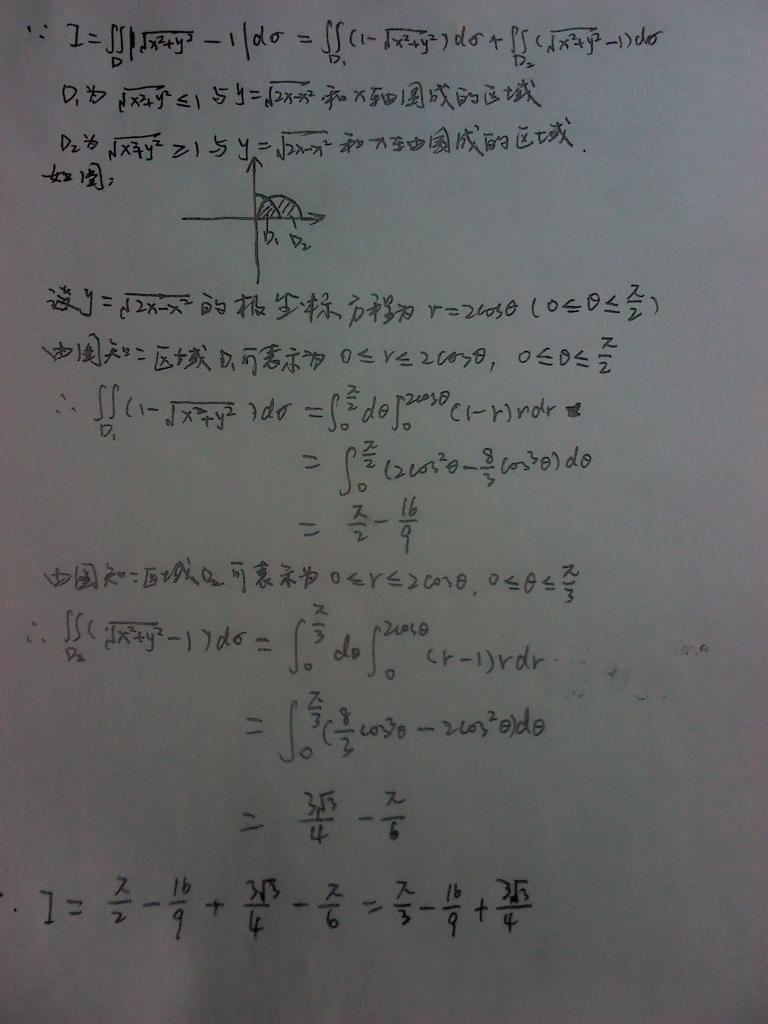 计算I=∫∫(D为积分区域)|√(x^2+y^2)-1| dσ,区域D由曲线y=√(2x-x^2)和x轴围成。 [ Last edited by keyi011 on 2012-12-18 at 22:18 ] |