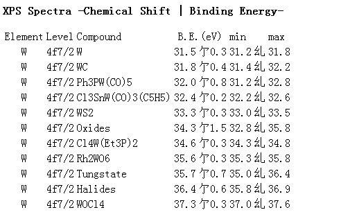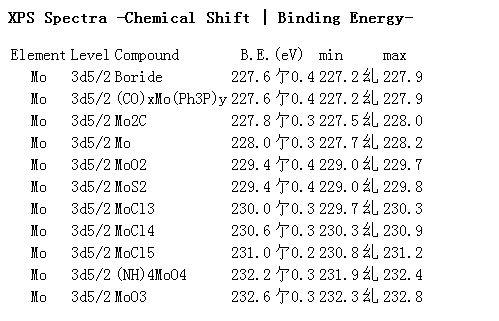 各位好,现求关于Mo和W不同价态XPS峰位置 ,比如Mo6+在232.6eV(3d5/2,),235eV(3d3/2)出现,急用,谢谢!