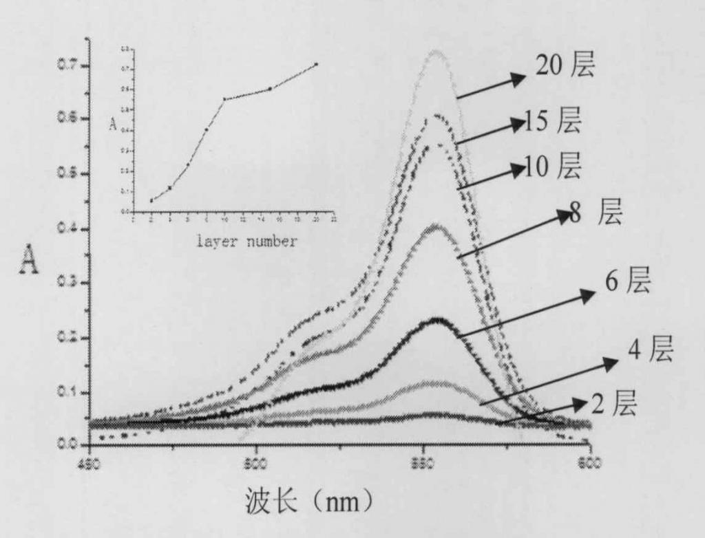 “制备2、4、6、8、10、15、20的复合材料,在400-600nm波长处测其紫外光谱,用复合材料在558nm处的最大吸光度对层数作图。”