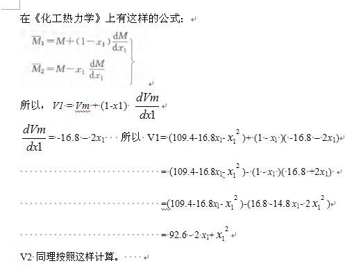 苯:V1=92.6+X1^2—2*X1 环乙烷:V2=109.4+X1^2 方法,这里的Vm其实相当于混合溶液的平均摩尔体积,即混合溶液总体积V=(n1+n2)Vm,其中n1是苯的摩尔数,n2是环乙烷摩尔体积,再将X1用n1,n2表示,即X1=n1/(n1+n2),代入Vm,将Vm表示成n1,n2的函数,最后将Vm代入V=(n1+n2)Vm,求得V用n1,n2表示,然后将V分别对n1,n2求偏导,即得偏摩尔体积V1,V2,然后再用X1=n1/(n1+n2)这个公式,将偏摩尔体积V1,V2中的n1,n2换成用X1表示,即得结果! |