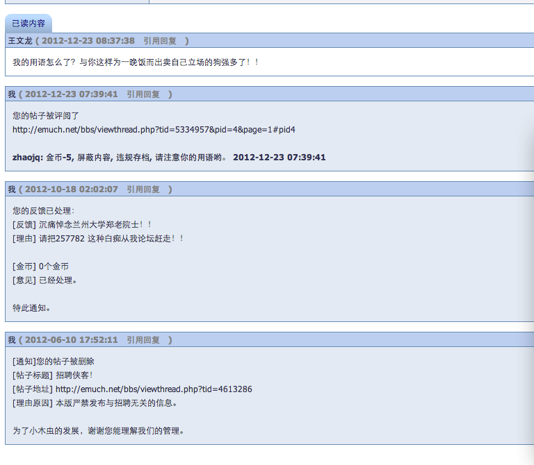 ID为 王文龙 的虫子:https://muchong.com/bbs/space.php?uid=848305,多次在教师之家等版块的帖子中攻击辱骂他人,见其违规存档:https://muchong.com/bbs/userlog.php?uid=848305,今天再次被违规处理后,不不思悔过,反而站内信息辱骂区长,特对其全论坛禁言15天处理,希望其改过自新,特此备案! 站内辱骂区长截图: |
