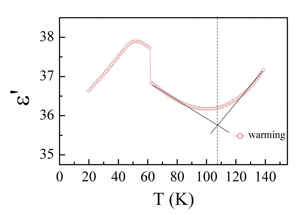 该材料的介电温谱如图所示。在110 K附近有介电的最低点。看到一些文献,说介电最低点,是斜率从正变负的转变点,这种情况下有铁电也是可能的。不知大家是否同意该观点?谢谢