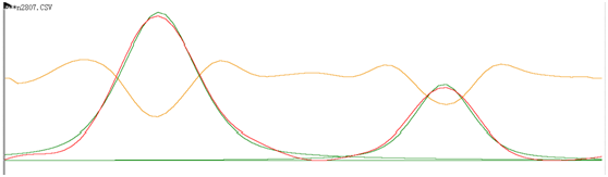在甲基和亚甲基的区间内对其进行分峰拟合,得到如下图(线型:红色的是原图,绿色是拟合出来的图,橙色的是二阶导数图谱)和数据: