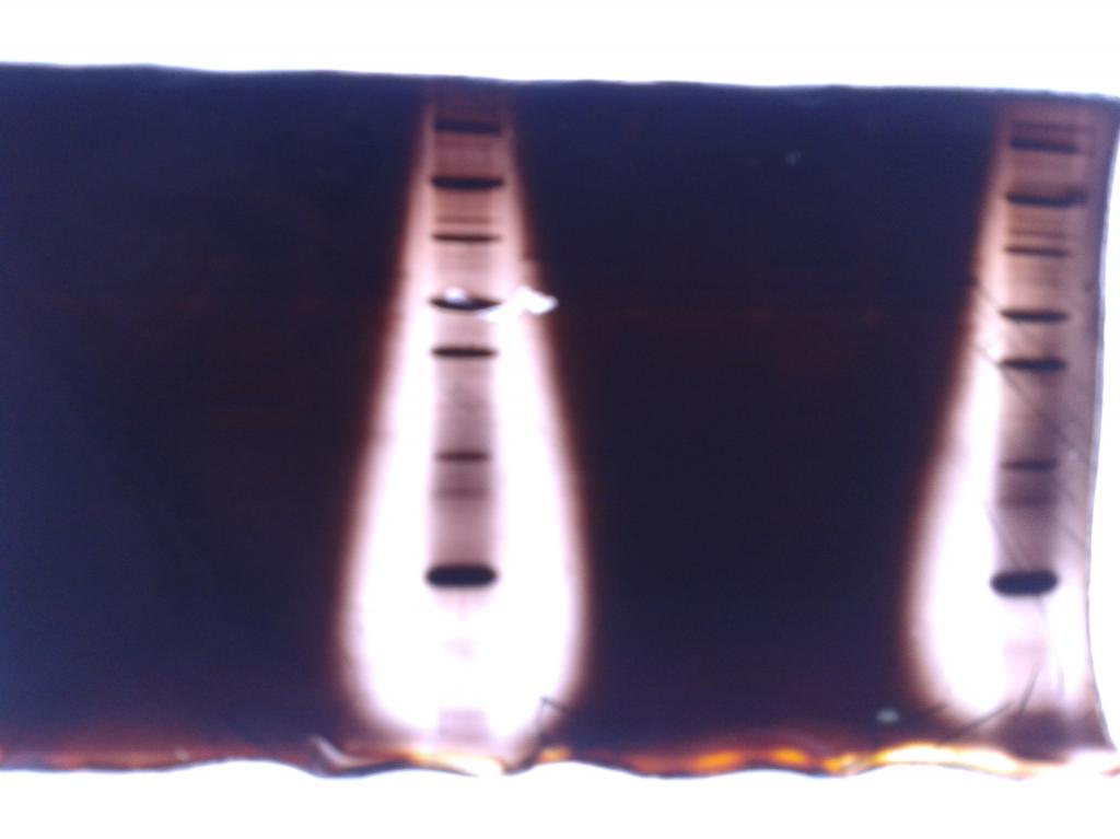 我刚刚接触银染这个技术,做了两次,两次都是同样的情况,Marker的那个泳道染色后呈弧形,干扰了附近的条带,不知道是什么原因,请问大家有没有出现这样的情况,谢谢 20121224_192003.jpg |