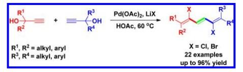 Pd(II)-Catalyzed Highly Regio- and Stereoselective Assembly of C-C DoubleBonds: An Efficient Method for the Synthesis of 2,4-Dihalo-1,3,5-trienes from Alkynols。 反应式见附图。 P5@K{@Q0K$VO7IIT2%GAI}U.jpg |