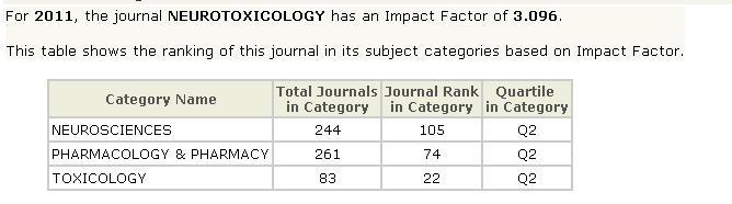 Rank Abbreviated Journal Title (linked to journal information) ISSN Total Cites Impact Factor 5-Year Impactor Factor Immediacy Index Articles Cited Half-life EigenfactorTM Score Article InfluenceTM Score 6303 NEUROTOXICOLOGY 0161-813X 4447 3.096 3.394 0.396 111 6 0.01085 |
