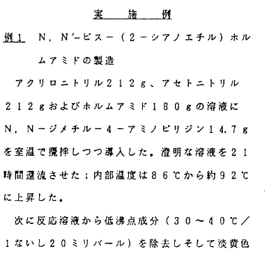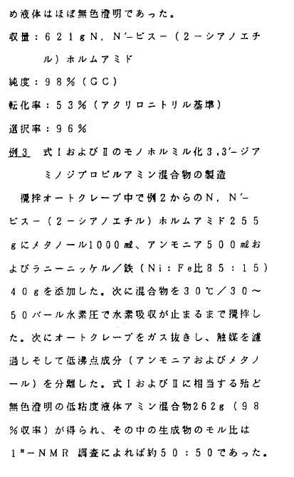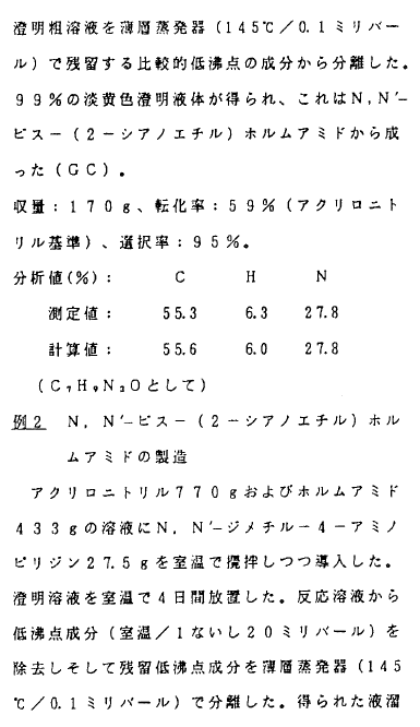 实行例 例1 N,N-双(丙腈)甲酰胺的制造 在室温下,向丙烯腈212g,乙腈212g及甲酰胺180g的溶液里,边搅拌边加入14.7gN,N-二甲基-4-吡啶胺。将澄清的溶液回流21小时;其内部温度约从86度上升至92度。 然后从反应溶液中除去低沸点成分(30-40度/1-20mbar),然后将得到的淡黄色澄清粗溶液于薄层蒸发器(145度、0.1mbar)中将残留的较低沸点的成分中分离出来。得到99%的淡黄色澄清液体,即为N,N-双(丙腈)甲酰胺(GC)。 收量:170g,转化率:59%(以丙烯腈为基准)选择率:95% 分析值 测定值 计算值 (按C,H,N,O计算) |
