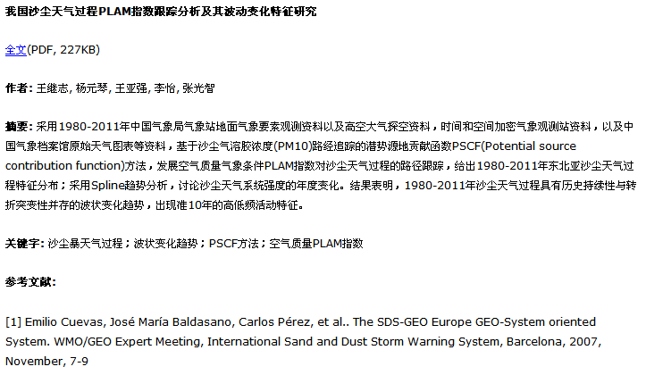 采用1980-2011年中国气象局气象站地面气象要素观测资料以及高空大气探空资料,时间和空间加密气象观测站资料,以及中国气象档案馆原始天气图表等资料,基于沙尘气溶胶浓度(PM10)路经追踪的潜势源地贡献函数PSCF(Potential source contribution function)方法,发展空气质量气象条件PLAM指数对沙尘天气过程的路径跟踪,给出1980-2011年东北亚沙尘天气过程特征分布;采用Spline趋势分析,讨论沙尘天气系统强度的年度变化。结果表明,1980-2011年沙尘天气过程具有历史持续性与转折突变性并存的波状变化趋势,出现准10年的高低频活动特征。