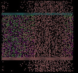 # 3d Morse crack simulation units metal boundary p p p atom_style atomic neighbor 0.3 bin neigh_modify every 5 delay 0 check yes # create geometry lattice fcc 4.05 orient x 1 0 0 orient y 0 1 0 orient z 0 0 1 region box block 0 60 0 40 -0.25 0.25 create_box 5 box create_atoms 1 box mass 1 26.9 mass 2 26.9 mass 3 26.9 mass 4 26.9 mass 5 26.9 # Morse potentials pair_style morse 2.5 pair_coeff * * 1.0 1.0 2.5 # define groups region 1 block INF INF INF 2 INF INF group lower region 1 region 2 block INF INF 38 INF INF INF group upper region 2 group boundary union lower upper group mobile subtract all boundary region leftupper block INF 20 20 INF INF INF region leftlower block INF 20 INF 20 INF INF region bonds block INF 20 19.75 20.25 -0.25 0.25 delete_atoms region bonds group leftupper region leftupper group leftlower region leftlower set group leftupper type 3 set group leftlower type 4 set group lower type 1 set group upper type 2 neigh_modify exclude type 3 4 neigh_modify exclude type 1 2 # minimize min_style sd minimize 1.0e-12 1.0e-12 10000 10000 # initial velocities relax compute new mobile temp velocity mobile create 750.0 887723 temp new timestep 0.001 thermo 500 run 10000 velocity upper set 0.0 0.04 0.0 sum yes velocity lower set 0.0 0.0 0.0 sum yes velocity mobile ramp vy 0.0 0.04 y 2 38 sum yes # fixes fix 1 lower setforce 0.0 0.0 0.0 fix 2 upper setforce 0.0 0.0 0.0 fix 3 all nvt 750.0 750.0 0.01 fix 4 all temp/rescale 100 750.0 750.0 3 0.01 fix 5 mobile deform 1000 y erate 0.003 units box fix 6 mobile setforce 0.0 NULL 0.0 compute 1 all stress/atom compute 2 all temp compute 3 all reduce sum c_1[2] compute 4 all pe compute 5 all ke variable 2 equal c_3 variable 3 equal c_2 variable 4 equal c_4 variable 5 equal c_5 fix 7 all ave/time 1 100 1000 v_2 v_3 v_4 v_5 file a_stress.txt thermo_style custom step temp pe etotal press vol thermo 200 thermo_modify temp new dump 1 all atom 1000 dump.crack.lammpstrj min_style sd minimize 1.0e-12 1.0e-12 10000 10000 run 200000 |