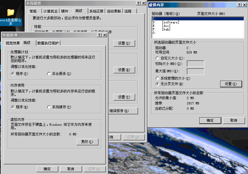啰嗦了这么多,其实方法很简单。只要关闭win的虚拟内存功能(分页文件设为无)。XP中 我的电脑》高级》 性能(设置)》高级》更改内存即可。这对目前动辄4G的PC绝对不是问题。但是一旦内存被占满,win无法分配虚拟内存后一旦任何程序有内存请求,都会直接挂掉。高斯也不例外