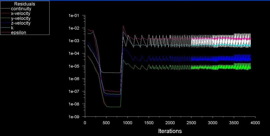 用离散相模型做气固耦合,模型如下图所示: 氢气从圆柱顶部进入,圆柱侧面有六根进煤粉颗粒的管道,是扁平的长方体 这个模型网格该怎么样划分? 我是把圆柱分成三段,先画中间段,然后再cooper,感觉网格质量不好 计算的时候连续相是好的,加入离散相后残差是这样子: 另外我出口选择的是pressure-outlet,是不是有影响? 问题出在哪里?求大侠指点 |