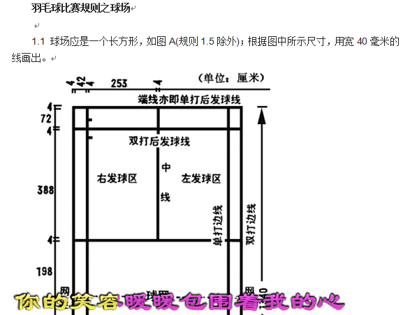 羽毛球比赛规则-羽毛球单打、双打规则详解 大家可能对羽毛球的一些规则不是很熟悉,但是现在你看了它,你就会很清楚! 羽毛球比赛规则-羽毛球单打、双打规则详解.doc(267KB) http://kuai.xunlei.com/d/LnU4DUMatOvuUAQA67e?p=130497 羽毛球比赛规则-羽毛球单打、双打规则详解.png |
