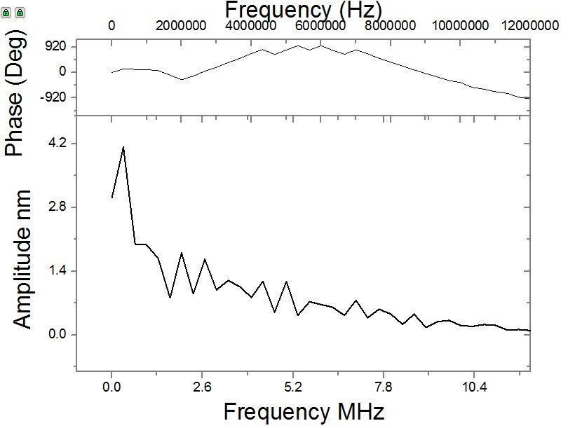 原始图是振幅-时间 图1,振幅、相位随频率变化的图像 图2,振幅(实部、虚部)随频率变化的图像(实部平方+虚部平方=振幅平方,与图1可以联系起来看) 图3,幅度随频率变化的图像 图4,频率域的功率谱信号图 |
