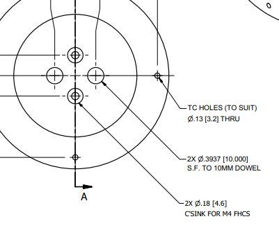 下面是一美国图纸,其中英文部分不怎能明白,望有心人指点! 1、TC HOLES(TO SIUT)等英文部分的意思 2、这里的“通孔”是有螺纹的吗? 3、S.F. TO 10mm DOWEL的意思,和2X0.3937[10.000]的意思一致吗? 在线等消息! 截图13.jpg |