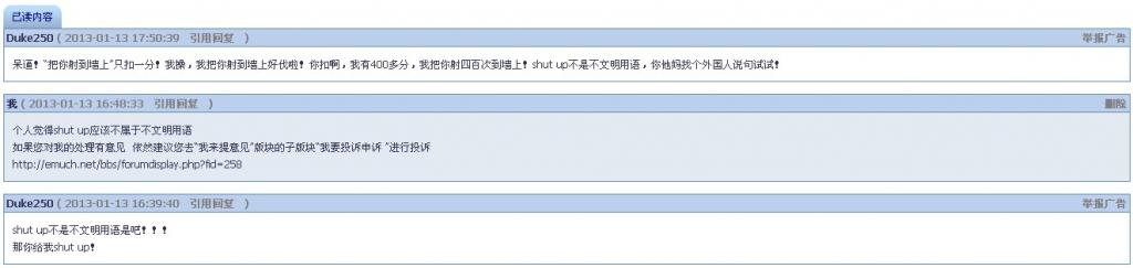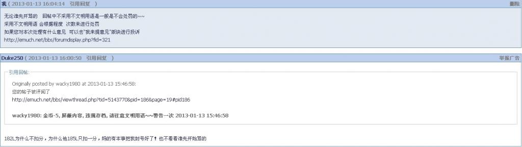https://muchong.com/bbs/viewthread.php?tid=5143770&pid=186&page=19#pid183 Duke250 在回复中使用不文明语言被扣BB后屡次PM我挑衅 具体见 与区长沟通后决定版块禁言一月 从2013-01-13至2013-02-13 [ Last edited by wacky1980 on 2013-1-13 at 21:29 ] |