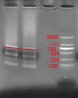 本人做RACE的新手。打算用同源克隆方法克隆目标材料的NAC转录因子,设计了兼并引物,起初打算先扩增核心保守片段,但没成功;然后直接拿兼并引物和TAKARA RACE试剂盒的引物做了3‘,50ul体系做了两管,扩增退火55度,30个循环,结果如图1 ,并切下了红线标注的部分,做了切胶回收。同一天,做了连接18T载体,体系按照说明书要求。然后转DH5α感受态细胞,并在200转,37度摇菌过夜。第三天摇菌12小时后菌液PCR,结果如图2,可问题出现了,