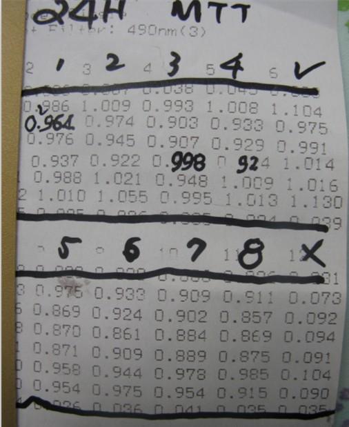 我做完MTT测试以后,得到如图的数据,但是不怎么处理,哪位虫友知道,帮下忙呗,谢谢啦!!图中的勾号是阴性对照,差号是阳性对照。画横线的数据是没有用的,一列共有六个可用数据,也就是OD值,这六个OD值分别代表什么呀? 未命名.jpg |